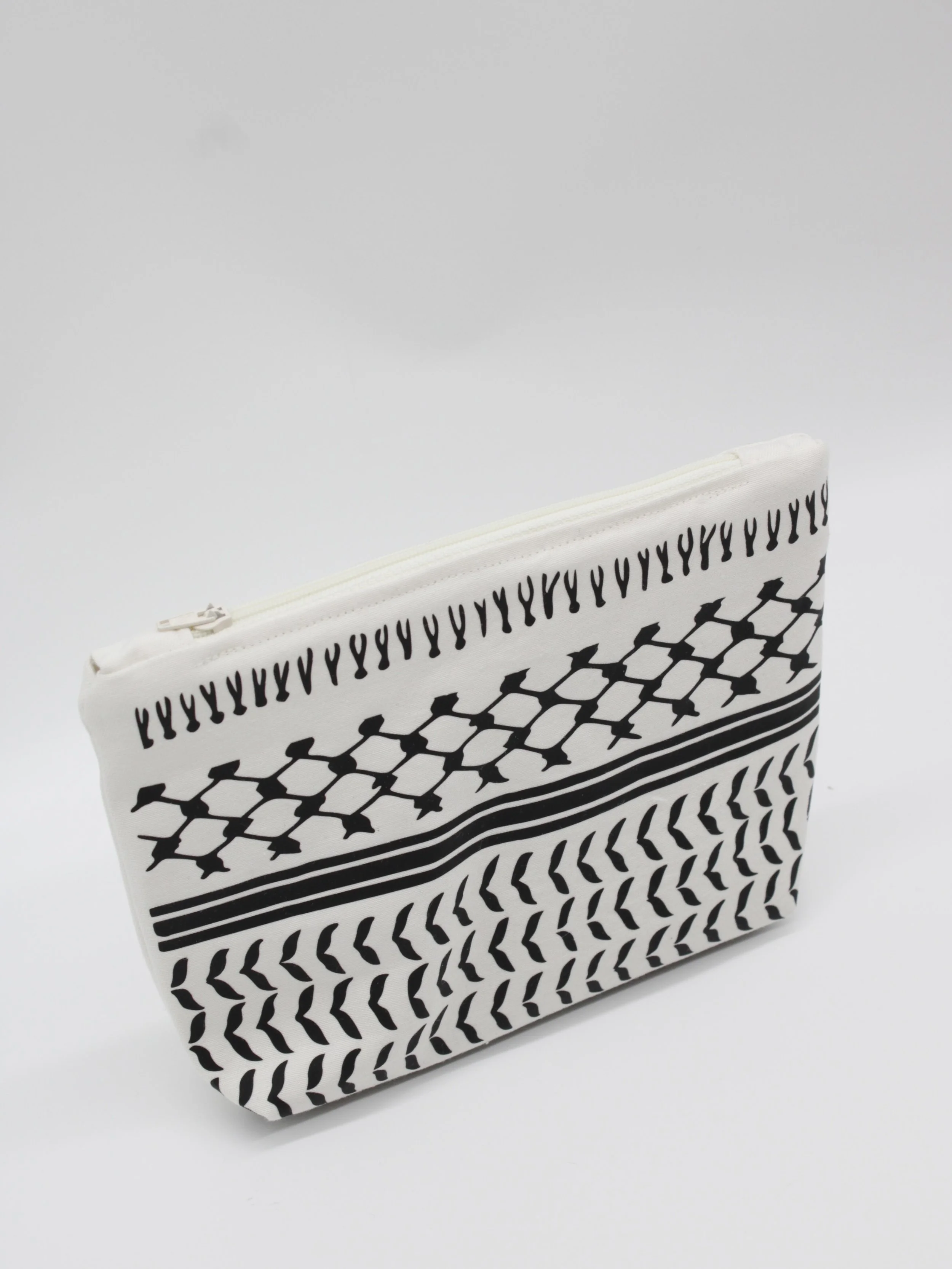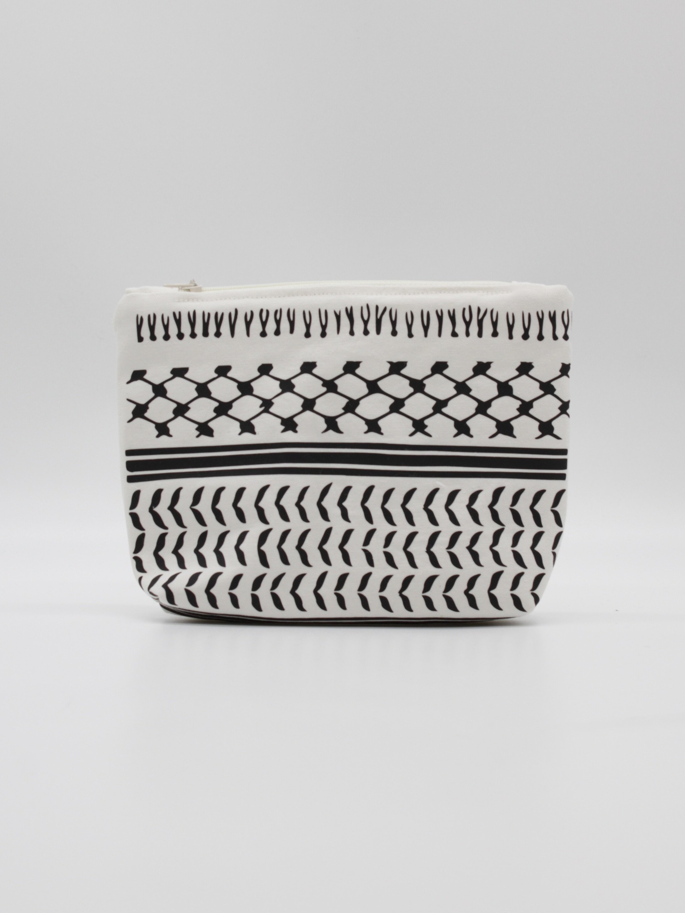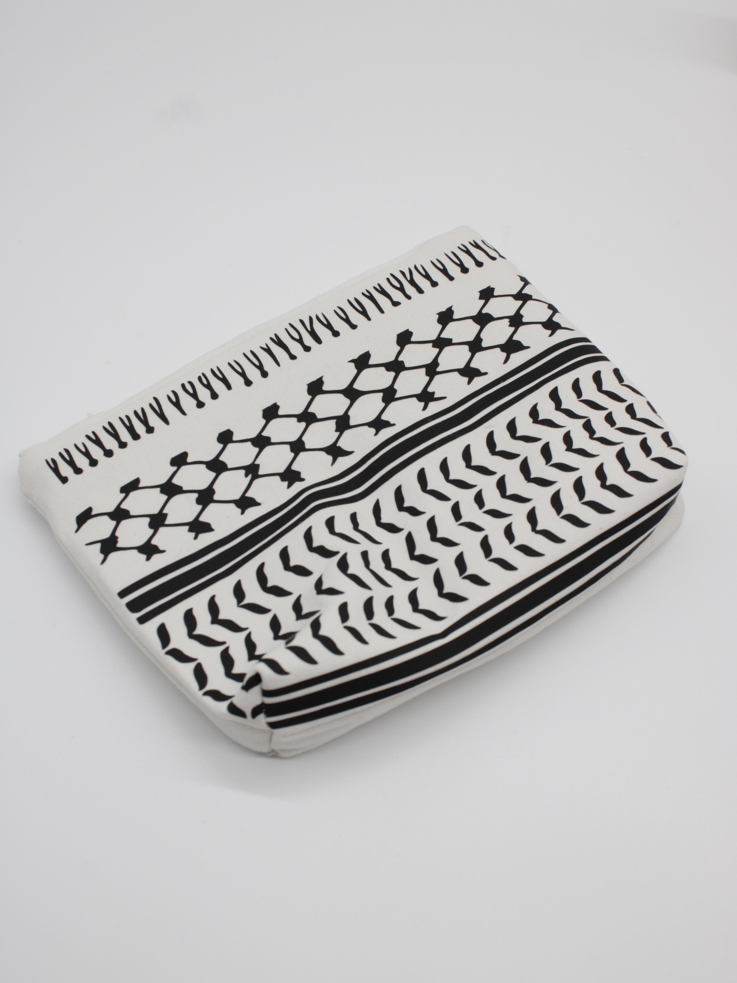 Das Kuffiyeh-Muster auf der Vorderseite ist inspiriert vom traditionellen Kuffiyeh-Muster – dem Symbol für palästinensischen Widerstand, kulturelle Identität und Zusammenhalt.